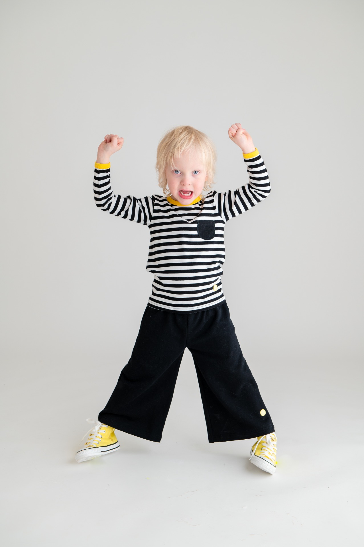 Leveälahkeiset collegehousut kuminauhavyötäröllä ja sivutaskuilla.