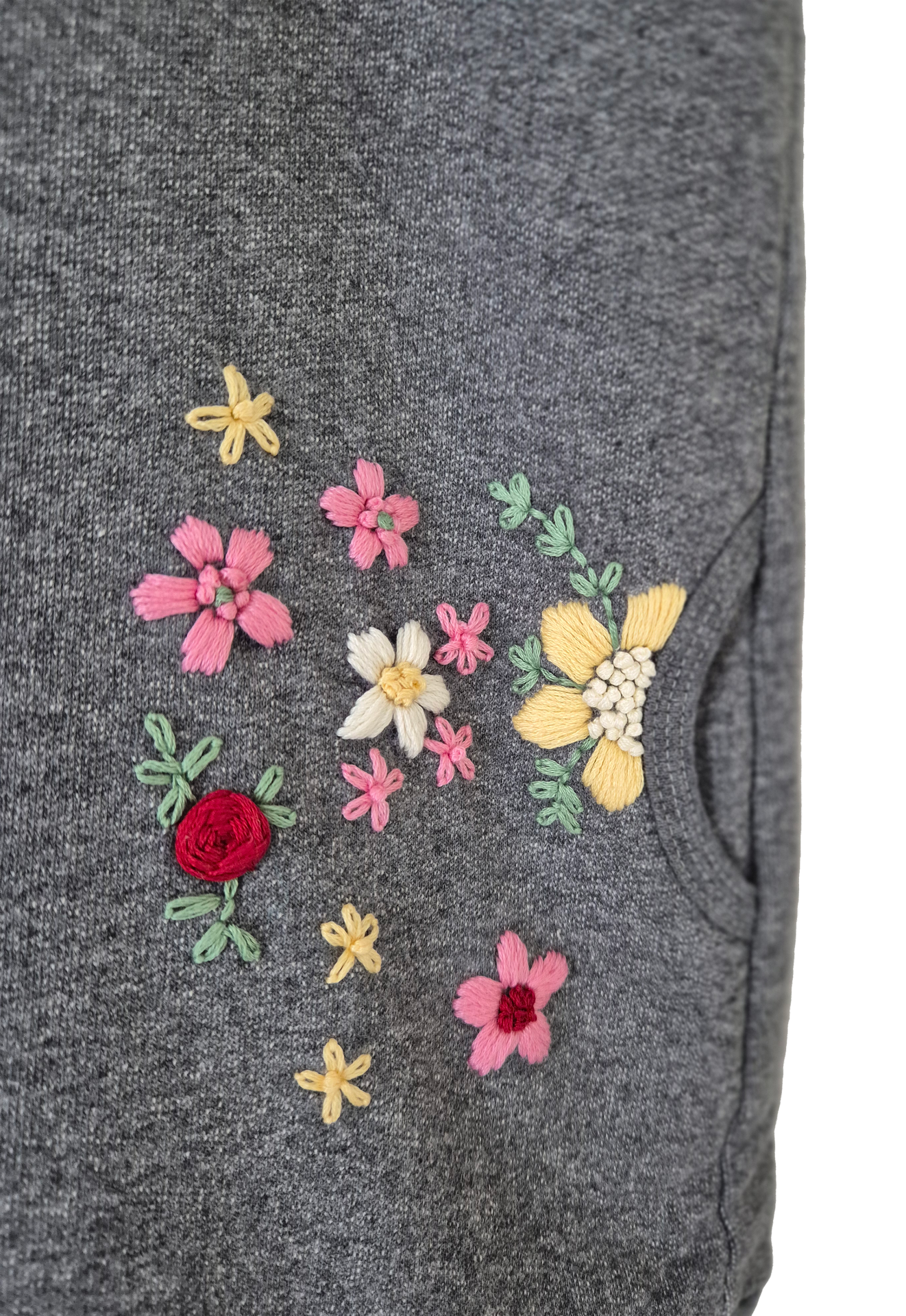 Kiva collegemekko taskuilla. Helmassa leveä resori. Vasemmassa helmassa kauniita käsin kirjottuja kukkia.